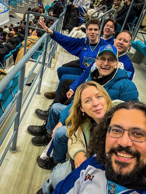 One final thing I want to talk about is my colleagues from Cardiff University who were part of the trip. Eamonn and Patrick are two Physics PhD students who were employed to support the teaching. Frankly, they were brilliant and also a bunch of fun. They made cosplaying a physicist as easy as it could be. We were also joined by Dr. Marcus Gomes and Dr. Laura Reynolds, who were teaching another course. I enjoyed sharing my time with them and am appreciative of the fact that they were there. It made the experience really enjoyable. Here we all are at an ice hockey game.