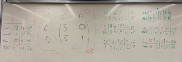 We watched an episode of a game show that Peter correctly realised was an example of a Prisoner’s Dilemma. After this we played an Iterated Prisoners Dilemma tournament.