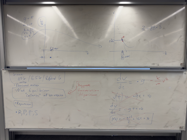 \[y(t) = -g t ^ 2 / 2 + v_0 t + y_0\]I then asked what was wrong with this and Peter correctly brought up air resistance. Indeed, with air resistance (which is in fact very rarely negligible in practice) the differential equation is: