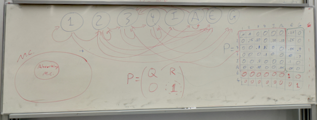 On the photo of the board you can see the general form of an absorbing Markov chain which must have at least one \(1\) in the diagonal which indicates that the corresponding state will never be exited once reached.